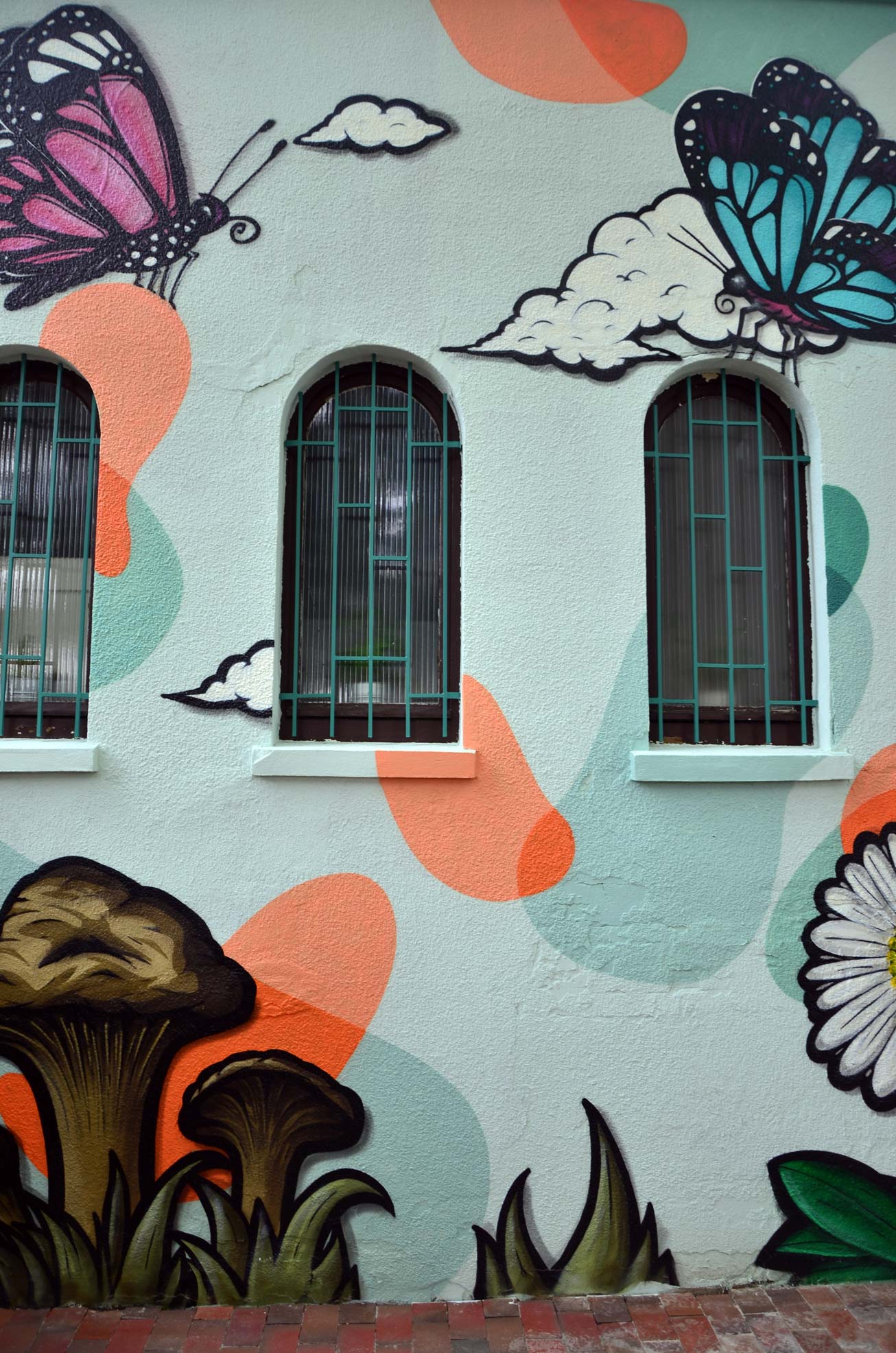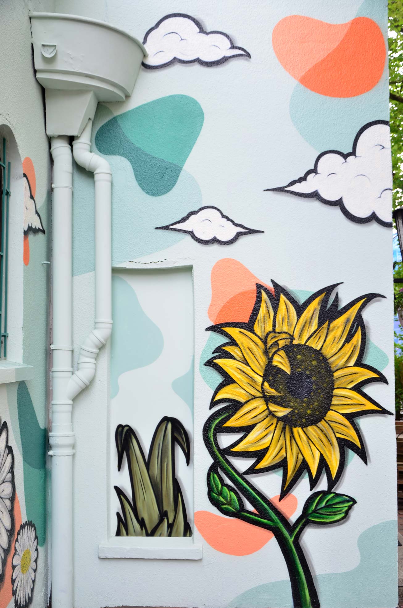 This commissioned graffiti gives the exterior façade of an organic restaurant in Oldenburg a fresh and natural charm. The aim was to create an inviting ambience that radiates harmony and vibrancy while establishing a strong connection to nature. The wall design combines lively, natural elements: The focus is on detailed flowers such as a magnificent sunflower and a delicate daisy, symbolizing freshness and growth. The motif is playfully complemented by colorful butterflies, whose delicate wings bring dynamism and lightness to the composition.